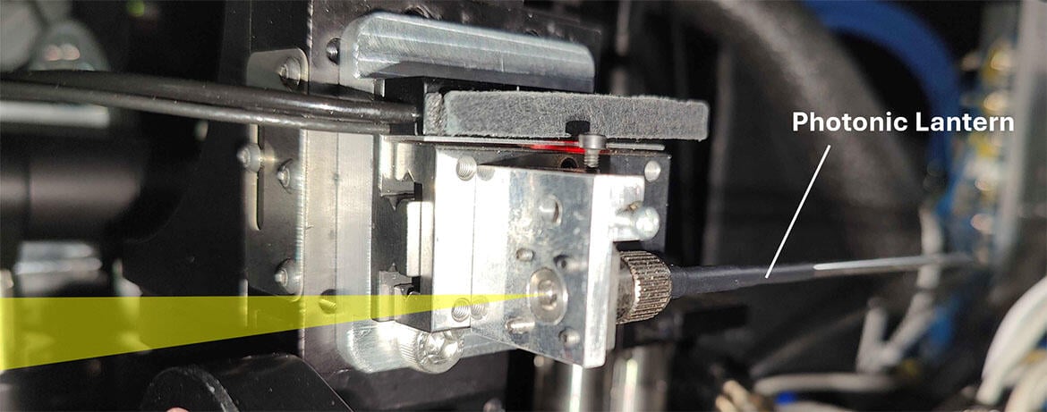Theh photonic lantern, a specially designed optical fibre, mounted on the FIRST-PL instrument at the Subaru Telescope. The yellow triangle indicates the path of the light entering the lantern. (Credit: Sébastien Vievard/University of Hawaii) Theh photonic lantern, a specially designed optical fibre, mounted on the FIRST-PL instrument at the Subaru Telescope. The yellow triangle indicates the path of the light entering the lantern. (Credit: Sébastien Vievard/University of Hawaii)