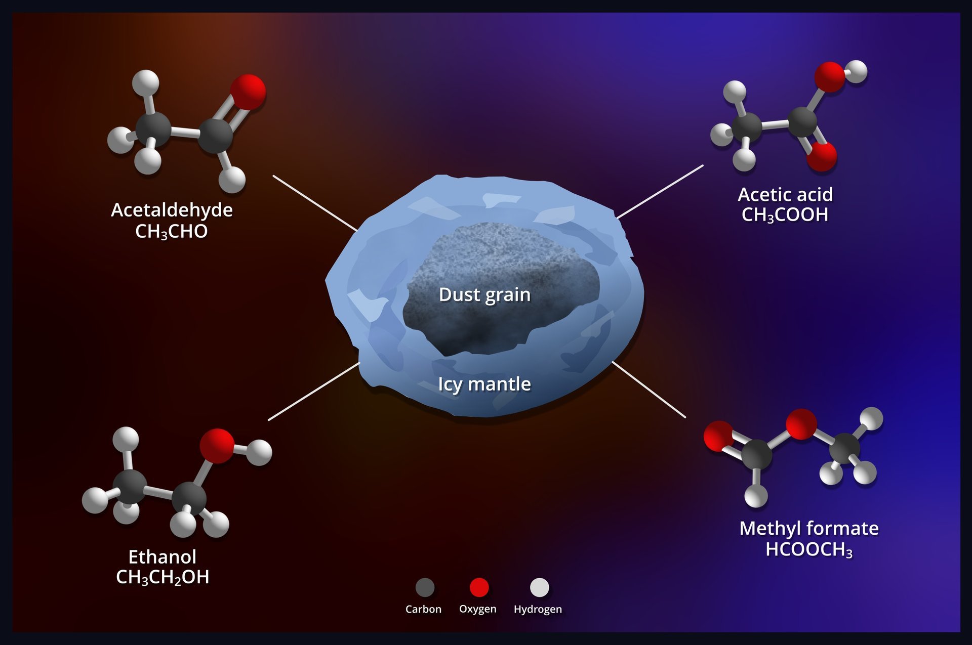 Diagram depicting the COMs detected on icy dust grains around ST6. Credit: NASA’s Goddard Space Flight Center.