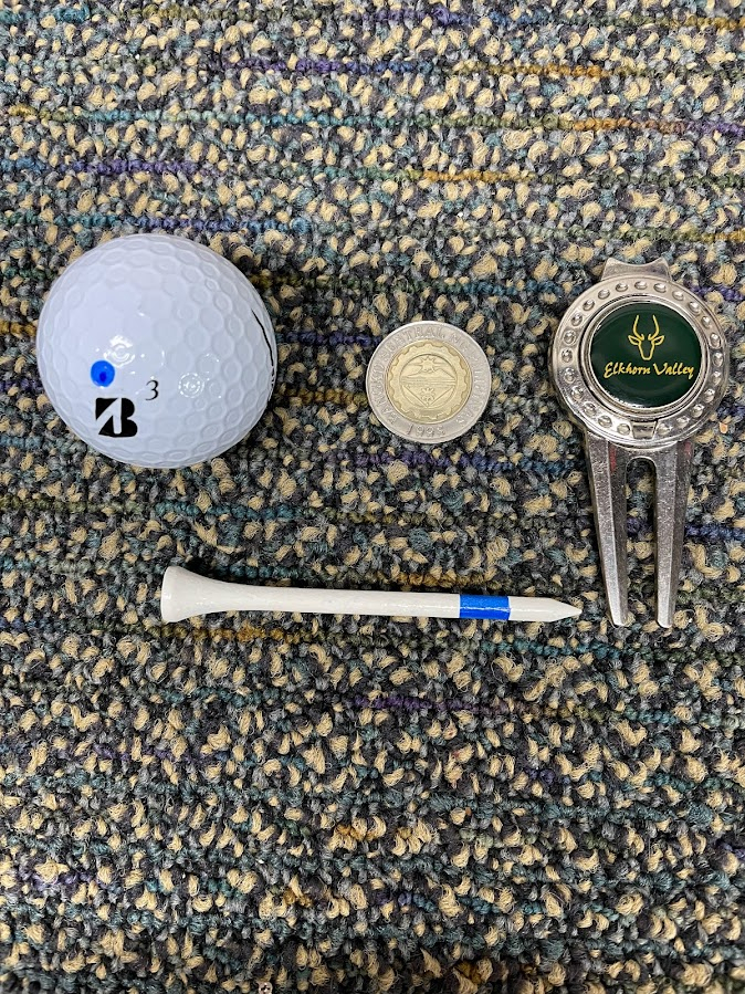 “Ball, Elk Horn divot tool, long tee, & Philippine 10-Peso coin/marker. Wallet, phone & keys removed…”