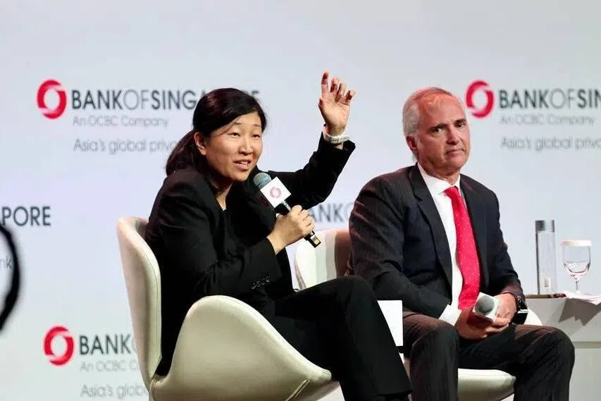 Jenny Lee (left) speaking during the Bank of Singapore Year 2024: Fast Forward to the Future event, and sitting next to Steve Okun, founder and CEO of Apac Advisors, 11 Jan 2024. PHOTO: SPH MEDIA