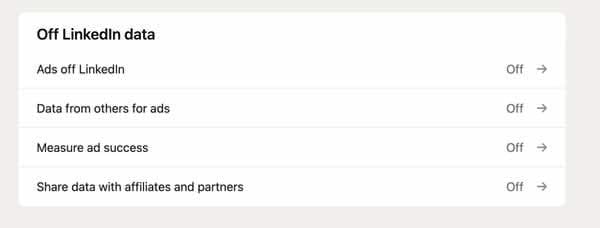If you scroll down you will see a number of options that can be toggled on or off: “Ads off LinkedIn”, “Data from others for ads”, “Measure ad success”, and “Share data with affiliates and partners”.