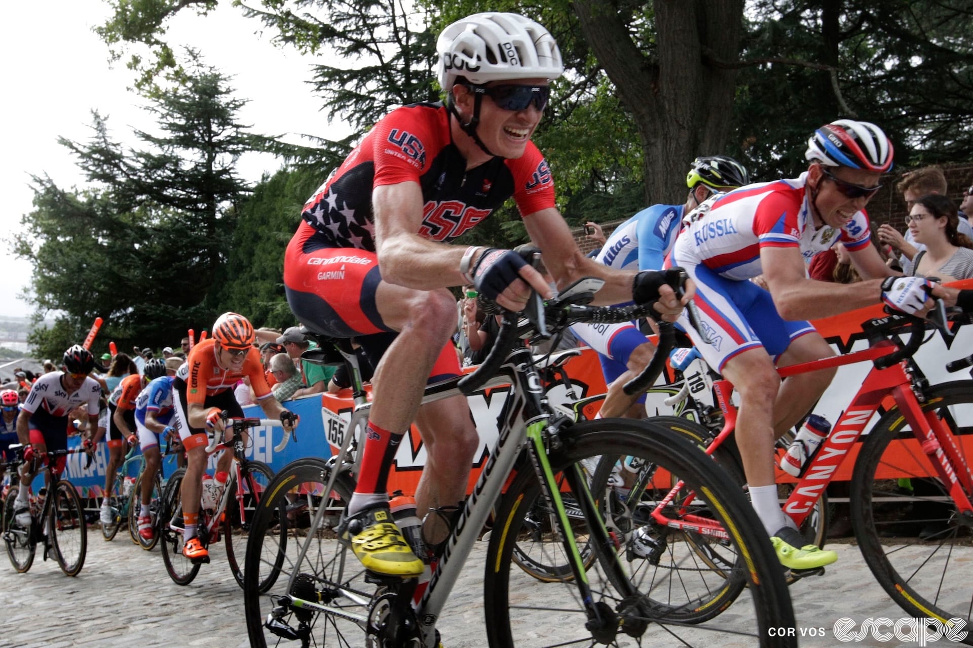Road Worlds were in the United States for the first time in four decades, after a five-year pull to bring the fight for the rainbow jersey to the East Coast. Nowhere on the 10-mile circuit was the energy as emphatic as it was on Libby Hill, the serpentine cobblestone climb that was the centerpiece of the race. American cycling fans took the climb as an opportunity to finally masquerade as the cycling-crazy fans they watched on television cheering on the heroes of the summer at the Tour de France.
