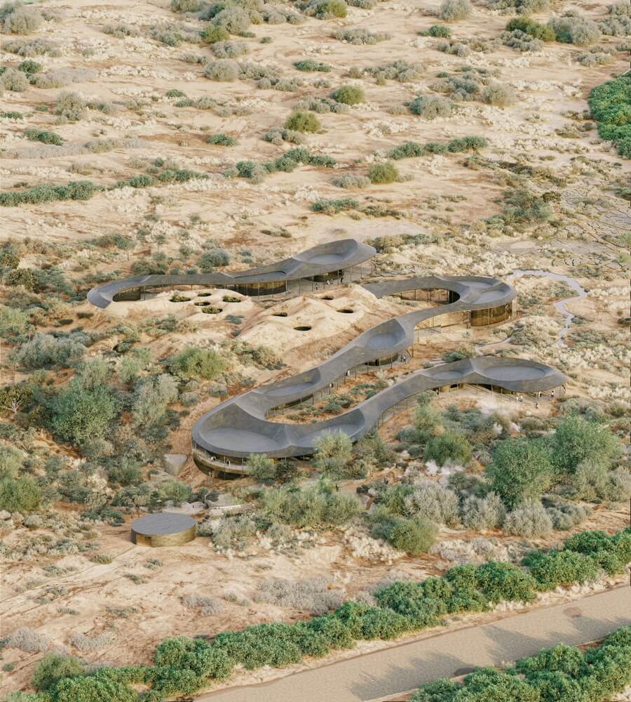 The team’s proposal is inspired by the “geometric order of the cultivated fields and the organic, meandering flows of the wadi systems” that manifest at the site, Tatiana Bilbao ESTUDIO said.