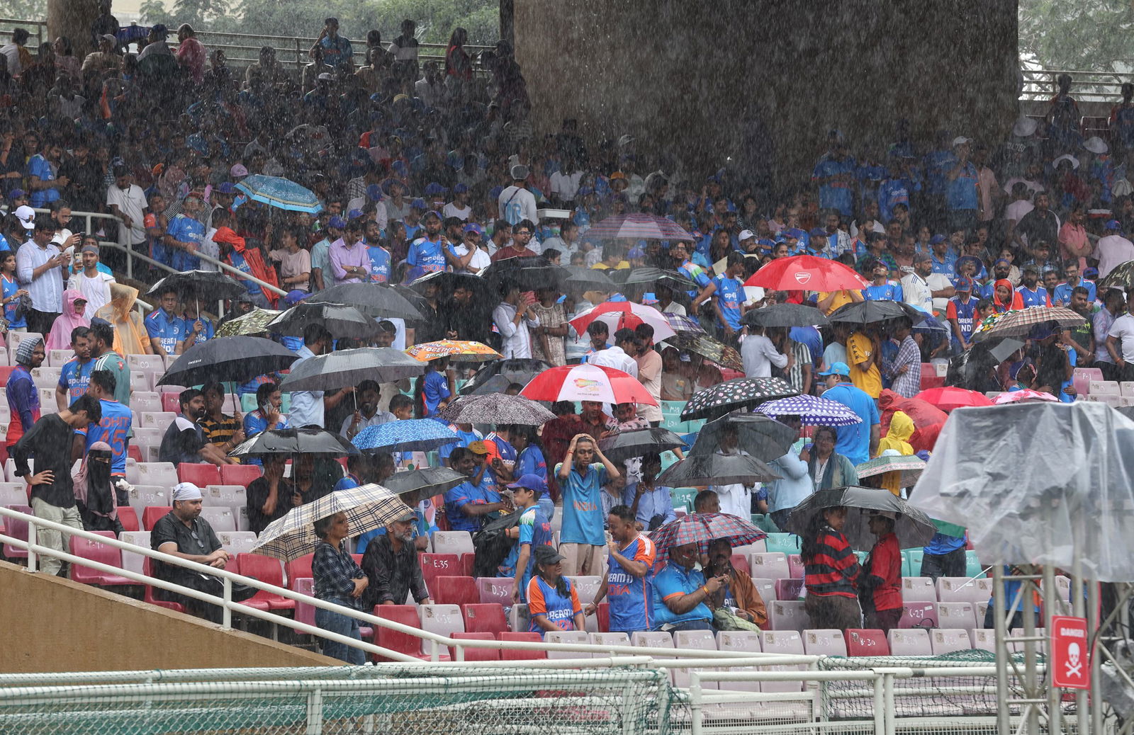 The rain has gotten a lot heavier in Navi Mumbai; the covers are back on and all the players – who had been warming up on the field – are huddled in the dugouts.