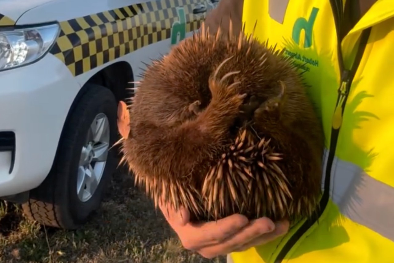 Senior Operations Officer Bailey spotted the little creature heading towards the tarmac on Wednesday and quickly scooped up the spiky marsupial before releasing it safely into nearby bushland.