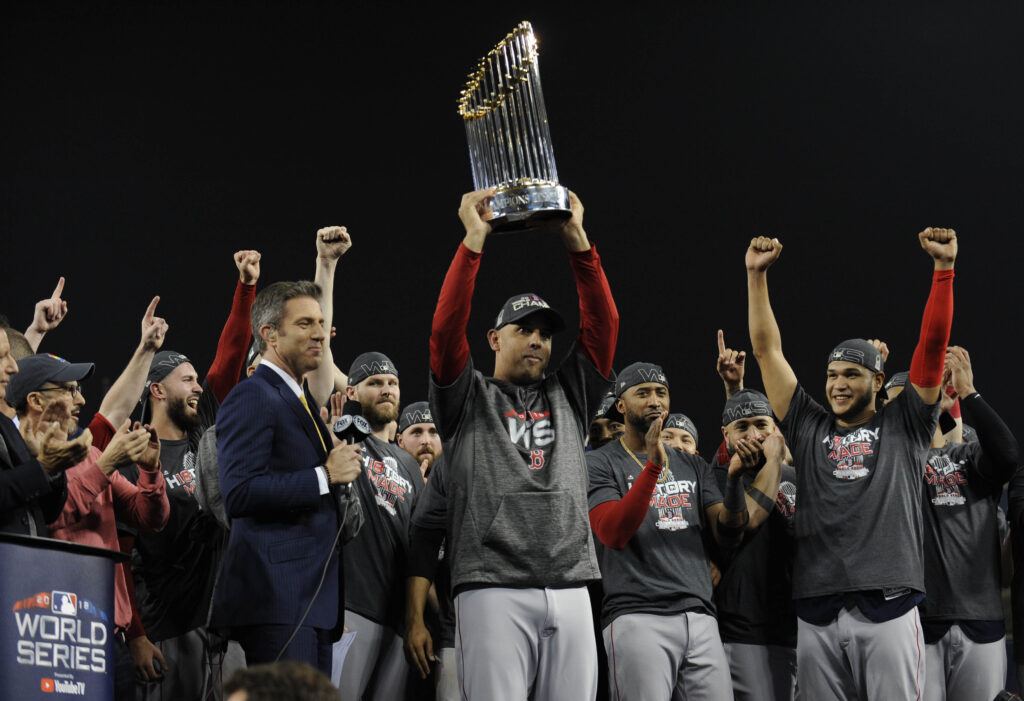Boston Red Sox – 9 ChampionshipsBoston Red Sox manager Alex Cora hoists the Commissioner’s Trophy after defeating the Los Angeles Dodgers in game five of the 2018 World Series at Dodger Stadium. Credit: Gary A. Vasquez-USA TODAY Sports