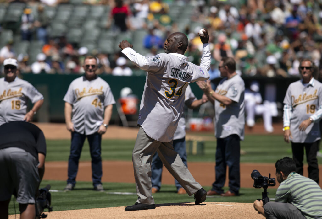 Oakland Athletics – 9 ChampionshipsFormer Oakland Athletics pitcher Dave Stewart throws out the ceremonial first pitch during a ceremony to honor the 30th anniversary of the 1989 World Series championship team before an MLB Players’ Weekend game at Oakland Coliseum. Credit: D. Ross Cameron-USA TODAY Sports