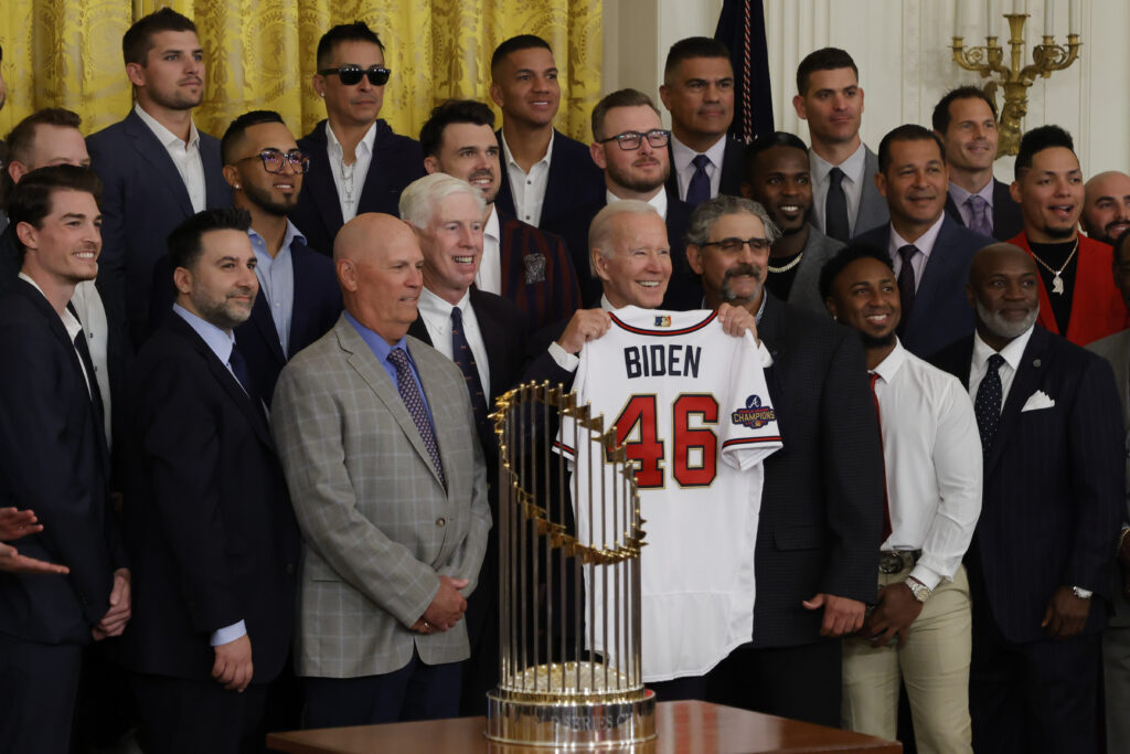 Atlanta Braves – 4 ChampionshipsPresident Joe Biden (M) holds a gift jersey while posing for a picture with players, coaches, and management of the Atlanta Braves during a ceremony honoring the 2021 World Series champion Braves in the East Room at The White House. Credit: Geoff Burke-USA TODAY Sports