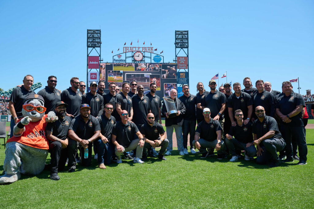 San Francisco Giants – 8 ChampionshipsMembers of the 2014 San Francisco Giants World Series Team pose for a group photo before the game between the Detroit Tigers and the San Francisco Giants at Oracle Park. Credit: Robert Edwards-USA TODAY Sports