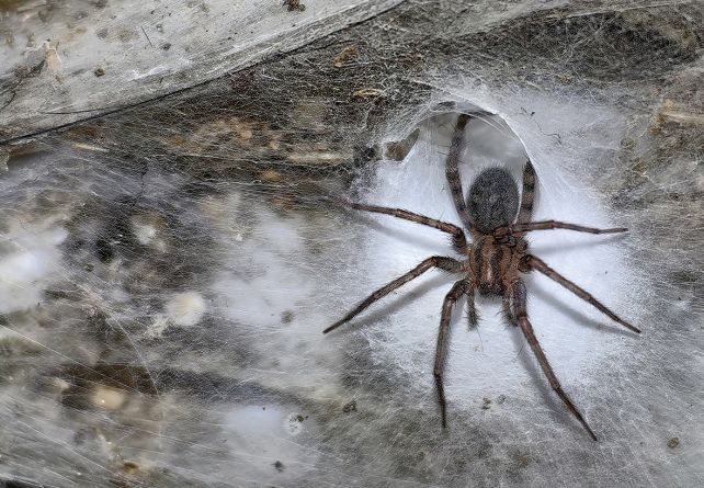 A female of the species Tegenaria domestica in one of the web’s funnels. (Urák et al., Subterr. Biol., 2025)