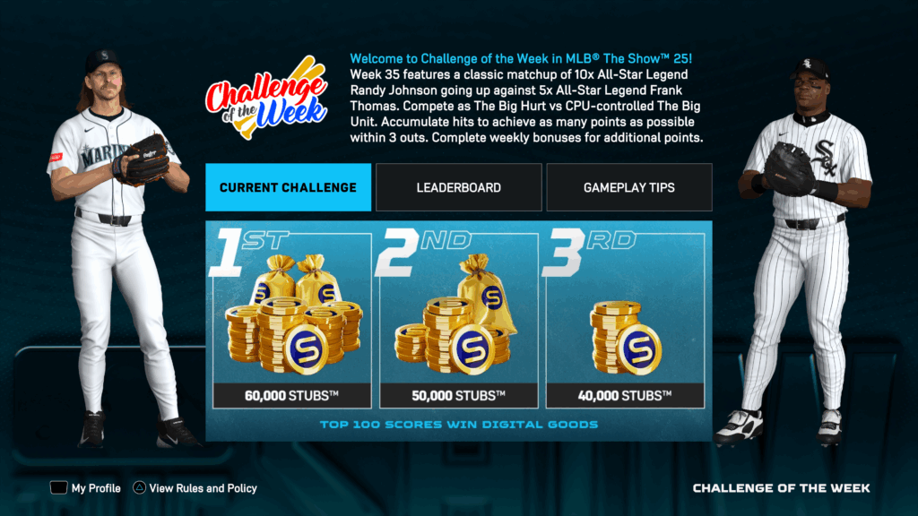 Challenge of the Week 35, available in Instant Action, features 10-time All-Star Legend Randy Johnson going up against 5-time All-Star Legend Frank Thomas. Compete as “The Big Hurt” vs CPU-controlled “The Big Unit” and accumulate hits to achieve as many points as possible within three outs for a chance to earn Stubs for use in MLB The Show 25.