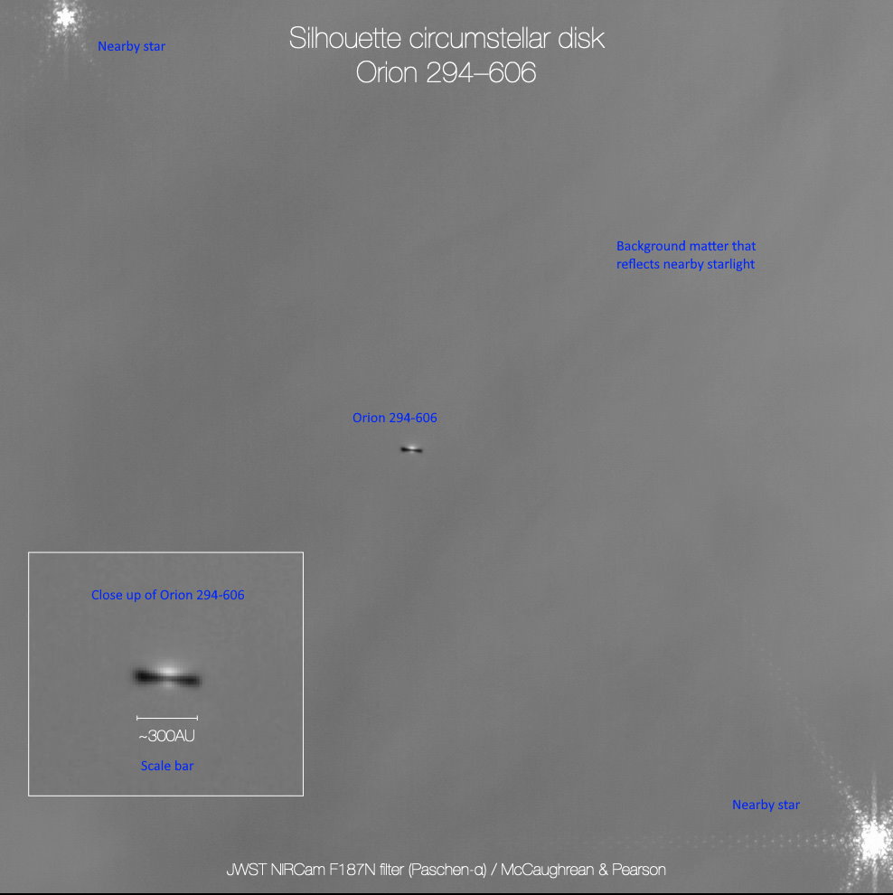 This wider-field view of the proplyd Orion 294-606 comes from the James Webb Space Telescope’s NIRCam instrument, observing at a wavelength of ~1870 nm, corresponding to a strong infrared emission/absorption line of hydrogen. The two nearest stars are only tenths of a light-year away in this flattened image, but are actually more than a light-year away each in three dimensions. The separation distances between young planet-rich systems, even within star-forming regions, can be surprisingly large. Over 130 protoplanetary disks have been found within the Orion Nebula alone.