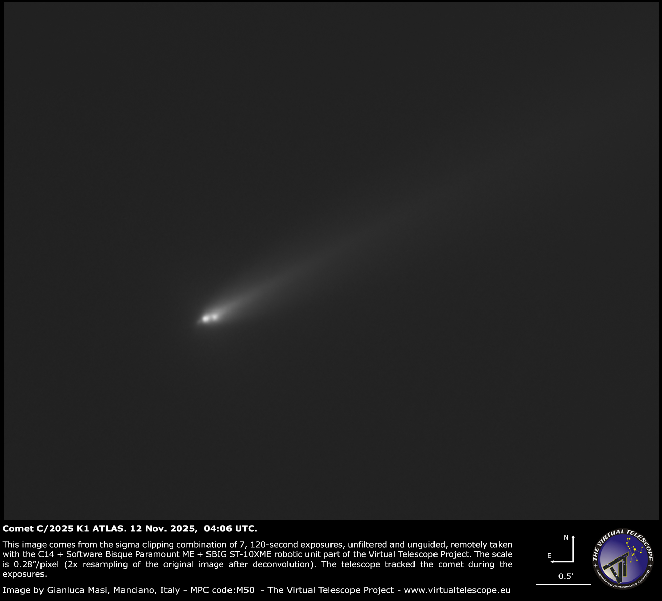 The image above comes from the sigma-clipping combination of seven, 120-second unfiltered exposures, remotely taken with the Celestron C14+Paramount ME+SBIG ST-10XME robotic unit available as part of the Virtual Telescope Project in Manciano, Italy.