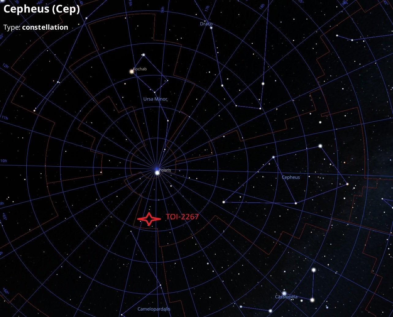 The bizarre worlds of TOI-2267 are located 190 light-years distant in the direction of the northern constellation of Cepheus the King, near Right Ascension 4 hours 20’, Declination +84 degrees 54’ north.