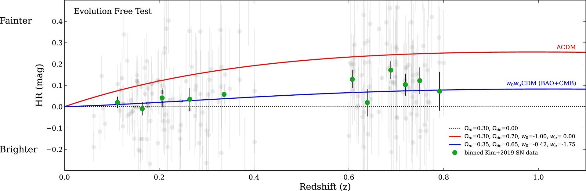 For example, the amount of matter and dark matter we observe in the cosmos isn’t nearly enough to slow down the rate of cosmic expansion. As the Universe expands, the mass density of the Universe decreases, meaning that eventually dark energy dominates cosmic evolution. If you tweak dark energy to be weaker, then there could be enough matter and dark matter to slow down cosmic expansion. The authors of the supernova paper looked at this kind of idea, referring to it as the Flat wCDM model. They found that while it fits the data better than the standard model in some ways, overall it isn’t a particularly good match.