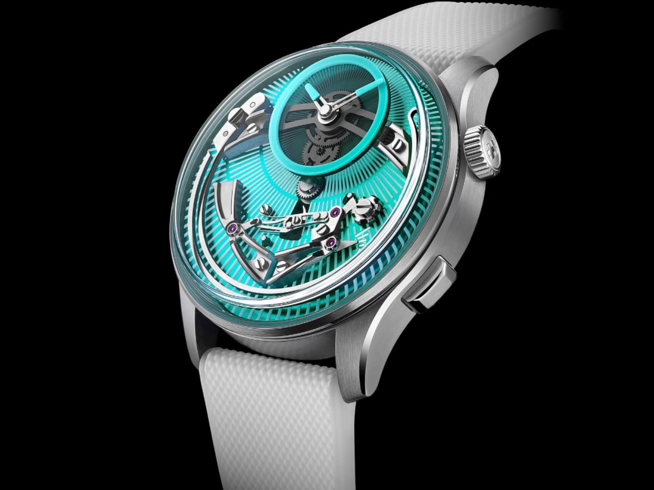 The floating Globolight X1 GL Blue ring serves as the watch’s visual anchor. The neon dial beneath creates contrast against titanium accents, and the visible striking mechanism adds mechanical intrigue. Every component works toward the same goal: making timekeeping feel less like utility and more like theater.