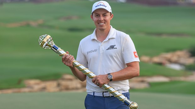 Matthew Fitzpatrick holds the DP World Tour Championship trophy Getty