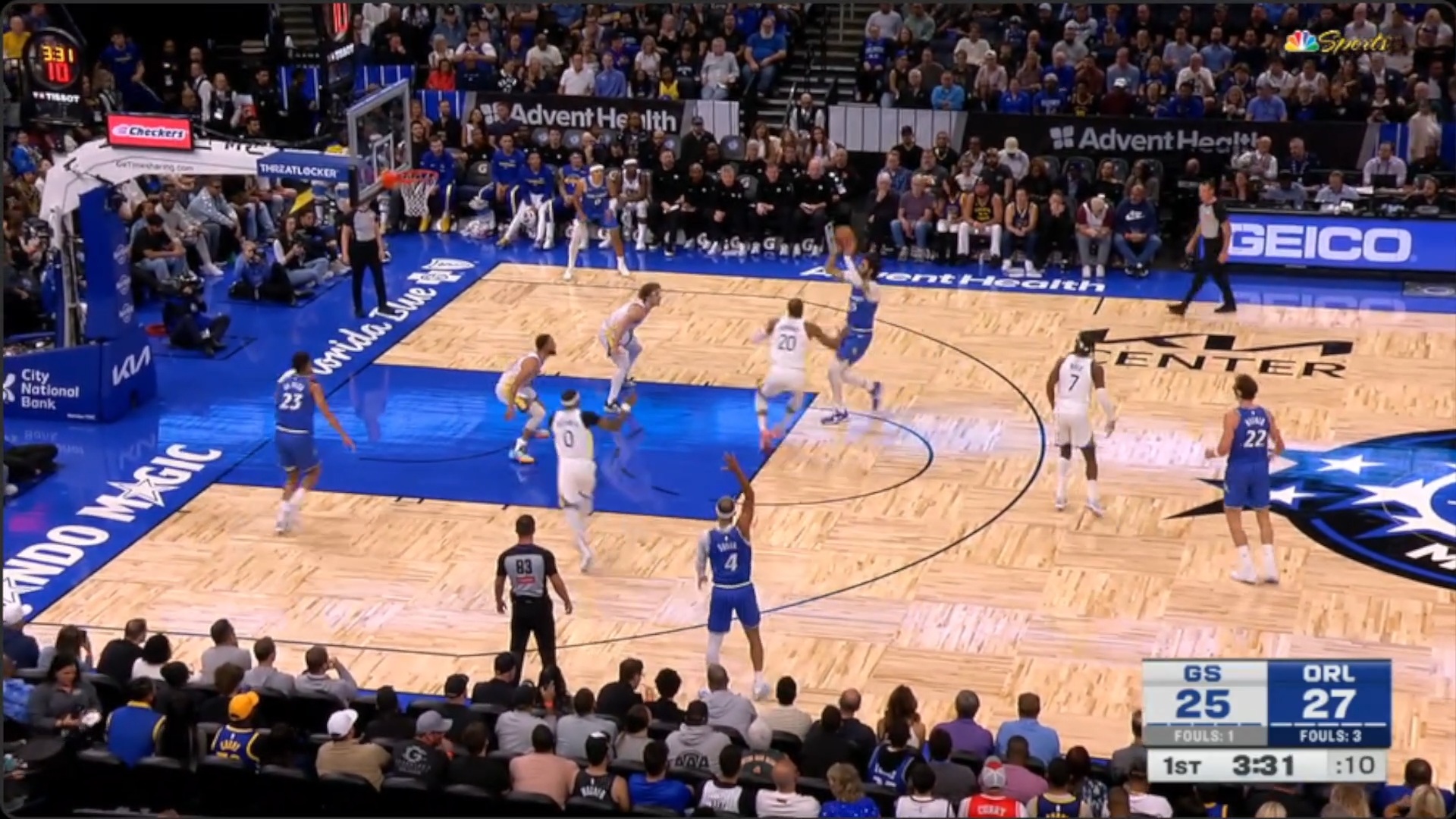 With Bitadze released on the short roll due to Horford stepping up, it compels the rest of the defense to help off and pinch in toward the paint, instead of being allowed to stay home if Horford had chosen to play deep-drop coverage. While the Warriors typically aren’t too worried about shooting by the likes of Anthony Black (in the right corner) and Jalen Suggs (in the left wing), what they give up instead is da Silva cutting along the baseline, behind the much smaller Curry, and making himself available for the lob pass by Bitadze: