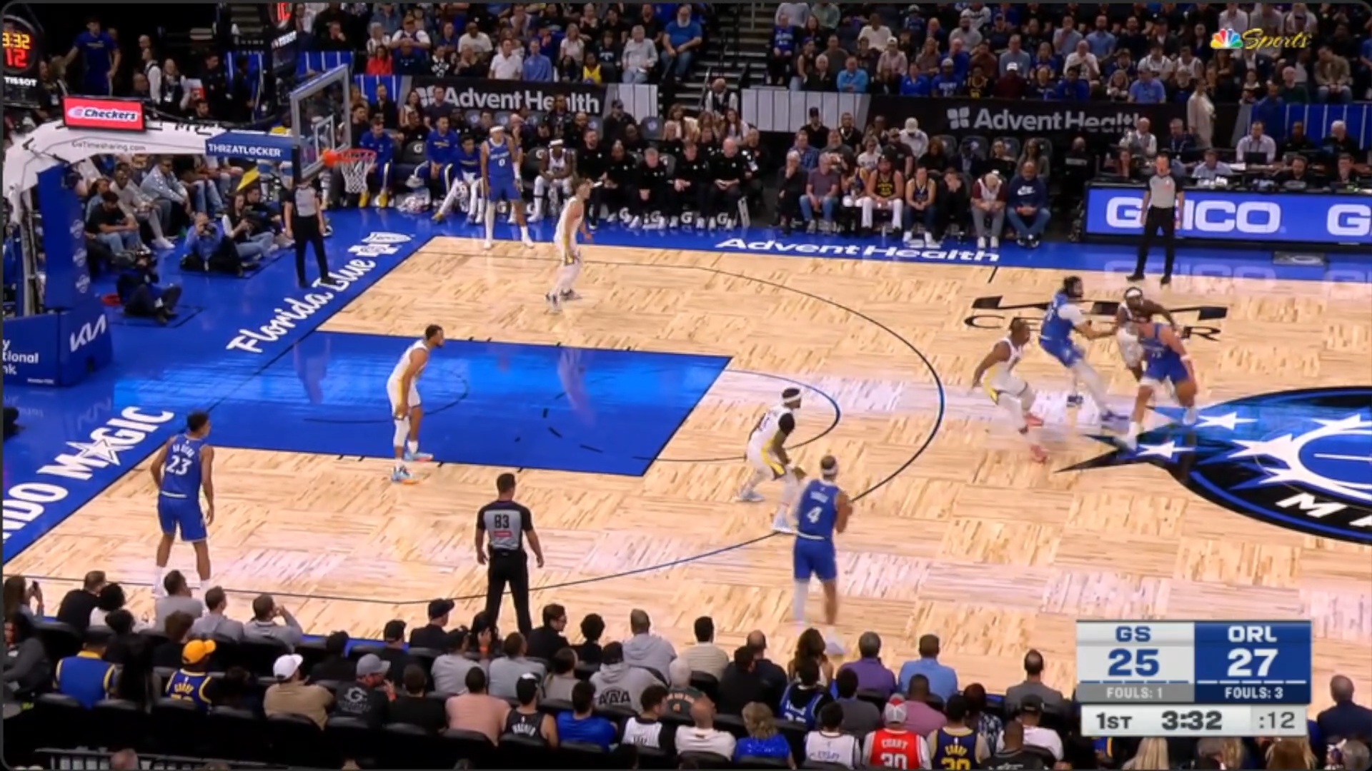 Once the Warriors went to a small lineup (small other than Horford, who, at the end of the day, is technically an undersized 6’9” center), the Magic simply involved Horford in direct action — drawing the Warriors’ sole rim protector away from the rim, exacerbated by Horford choosing to step up to the level of the screen against Wagner, who shoots a measly 29.1% on pull-up threes this season. One would think that having a shooting profile such as that would command a deep-drop coverage instead of a high step-up, if only to keep Horford closer to the rim.