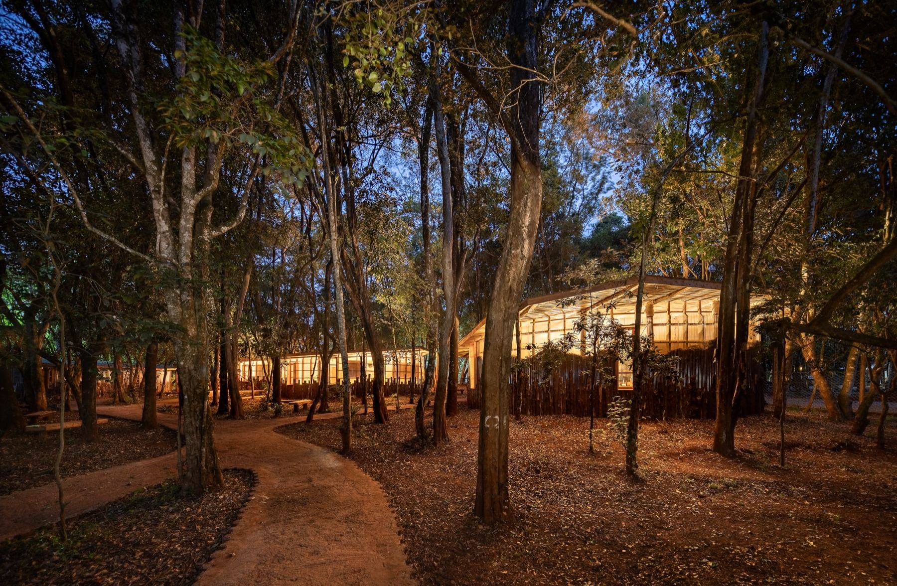 Description: A semi-permanent primary school campus in Nairobi’s forest poetically merges classrooms with nature, utilizing modular, earth-filled walls and lightweight roofs.