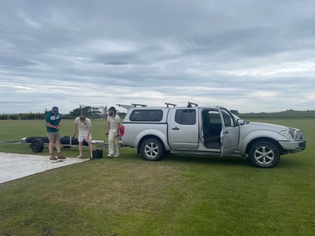 The pitch covers going back on the ground after the match, Dean Hutch, his son Max, and Ethan Coverdale.