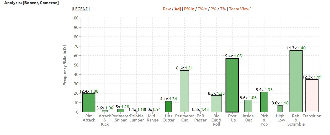 He has some big man tendencies on offense: He posts up, he crashes the glass for putbacks, he is used as a cutter, and he is used as a popping big at times. Many “eye-test scouts” will say he has a limited advantage creation, and I’ve had my doubts too about him being an on-ball forward who attacks from the perimeter, takes people off the dribble, and does the cute little pull-up jumpers that are associated with dynamic scorers, but what if I told you that’s not the only way to create your own shot? Cam has only been assisted on 39.1% of his shots at the rim — that means 60.9% of his shots are self-created. How? You can see it above, his most used playtype, putbacks (Reb & Scramble). Putbacks aren’t the prettiest form of self-creation, but they are efficient self-creation. Basketball analysts have repeated time and time again that baskets at the rim and 3PT attempts are the most efficient shots in modern-day basketball, and that’s Cam.