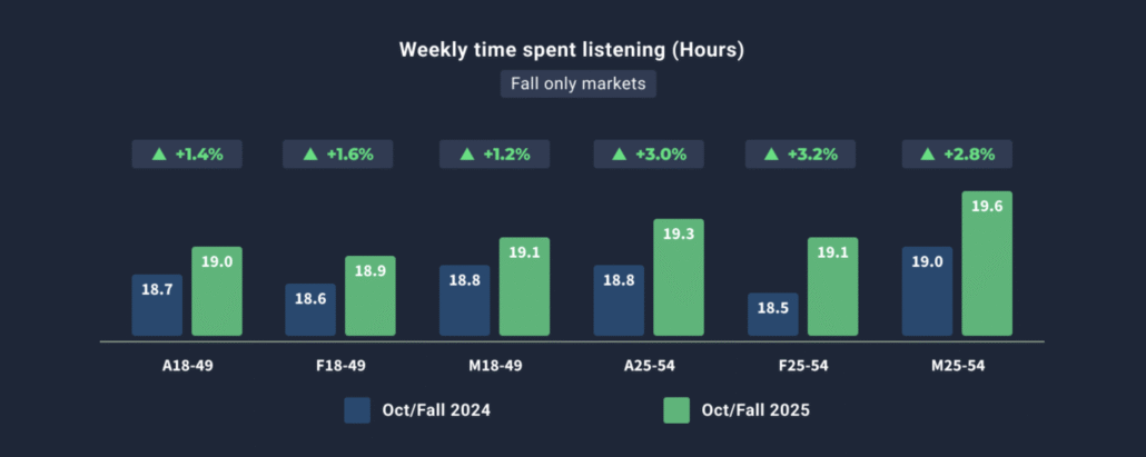 radioCount’s fall 2025 release saw reach and time spent listening grow year-over-year across all demos. Across all markets combined, radio reached an average of 2.1 million people, 12+, a 1.7% increase over fall 2024. Listeners spent an average of 17.9 hours listening to radio, up 0.8% year-over-year. Both the continuously measured and fall-only markets also had gains in cume from a year ago. For the fall-only markets, overall time spent listening rose from 17.9 hours a week in fall 2024 to 18.1 hours this year. Average weekly cume increased 1.8%, reaching 1.67 million people. radioCount says cume and radio tuning continued to trend upward among both the key adult 18-49 and 25-54 demos. Read more here.