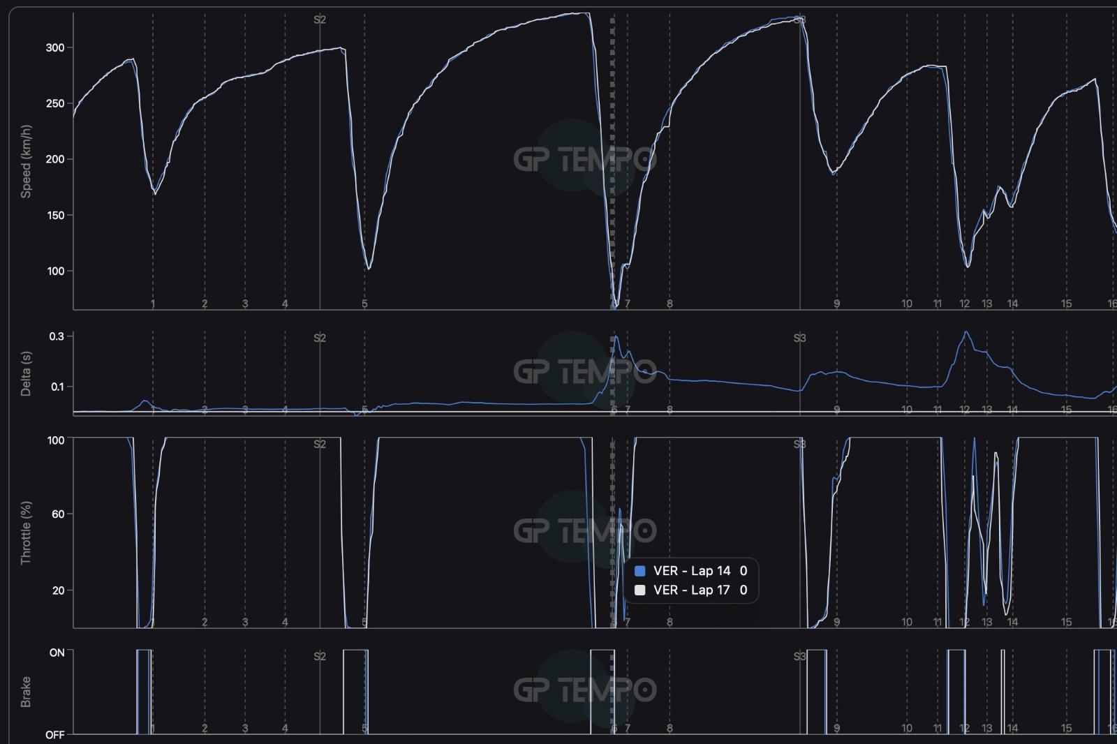 Again, Norris was a little cautious, earlier off the throttle rounding Turn 11. Piastri and Verstappen preserved more speed through the sharp right-hander at Turn 12 – indeed, Piastri, came tantalisingly close to drawing level with Verstappen’s time. But the Dutch driver was able to get to full throttle between here and Turn 13, proving decisive as both McLarens fell back. It was an advantage he would preserve, despite running too far over the kerb and losing some momentum at the final corner.
