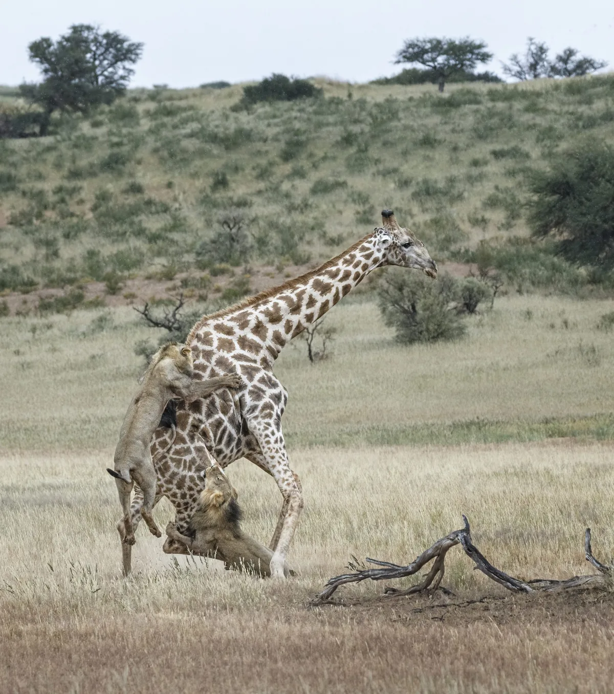 Joining forces, two male lions take down an adult giraffe from the back. Although lions are powerful predators, giraffes are not typical prey – their size, height and powerful kicks make them dangerous to hunt. Credit: Getty Images