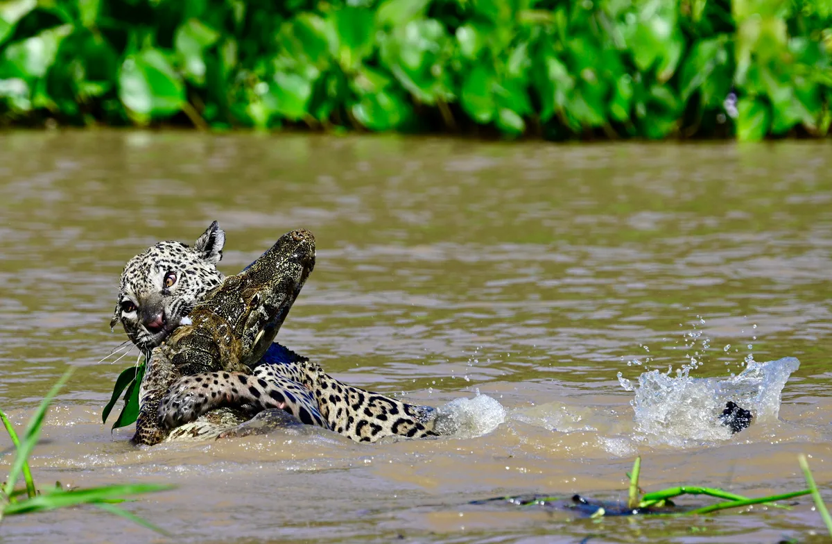 A caiman thrashes as a jaguar seizes it in a river in Brazil’s Pantanal region. Jaguars are powerful swimmers and often hunt in water. Credit: Getty Images