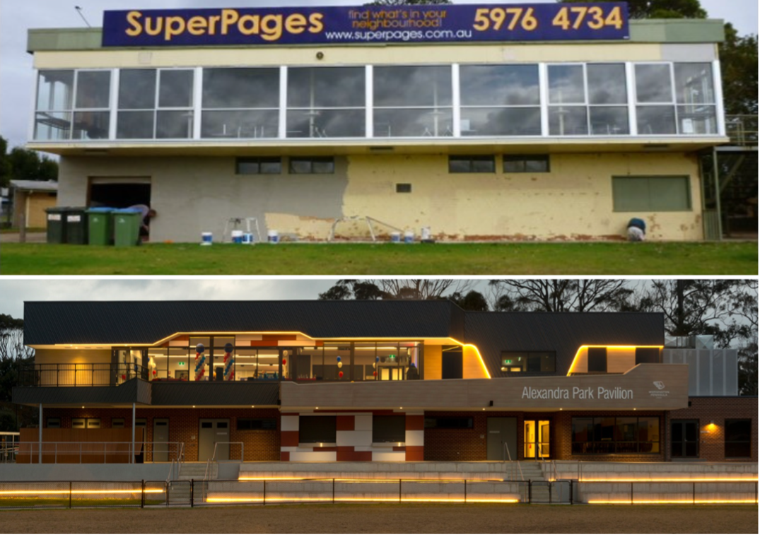 A before and after of the redeveloped pavilion at Alexandra Park. Image: Supplied
