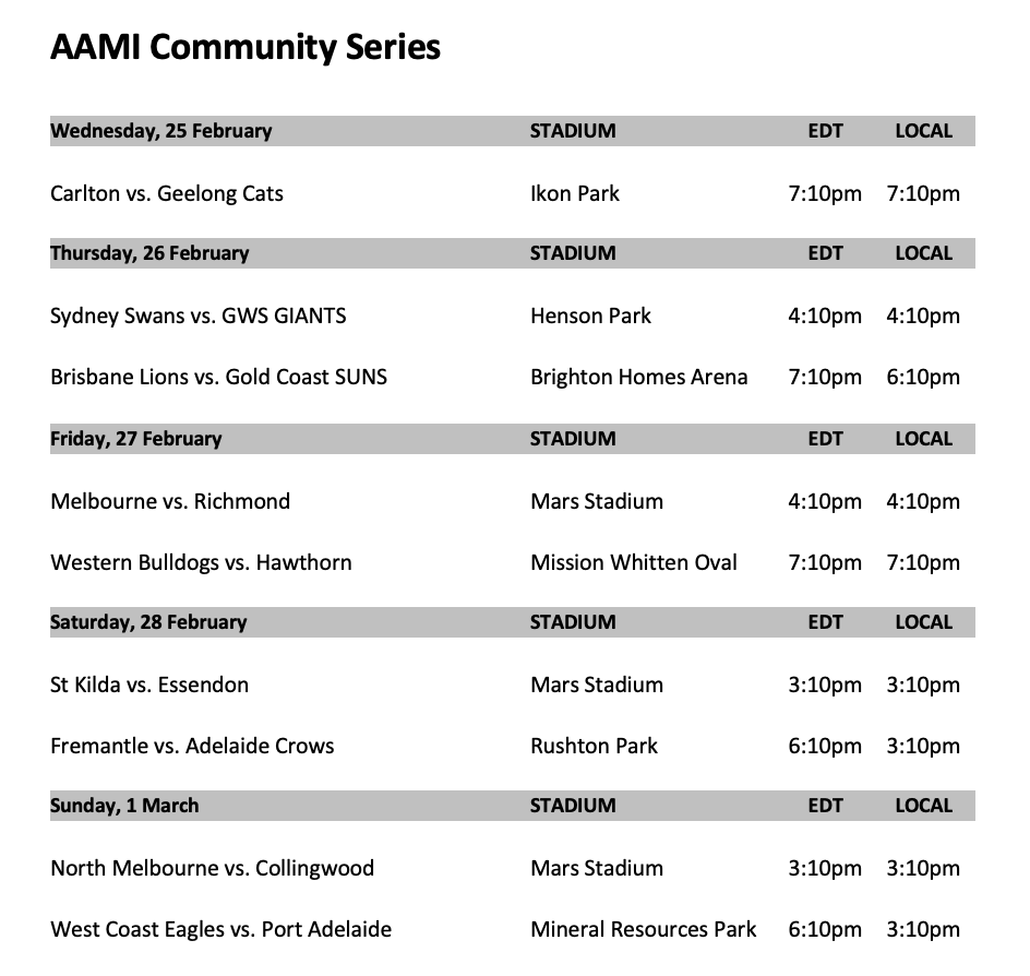 Melbourne will face Richmond on Friday, 27 February, followed by St Kilda vs. Essendon on Saturday and North Melbourne vs. Collingwood on Sunday.