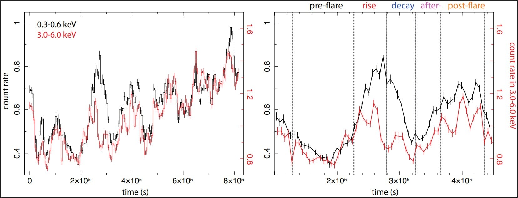 *This panel on the left shows the flare divided into five periods. The panel on the right shows the main flare and its x-ray variability. Image Credit: Gu et al. 2025. A&A*
