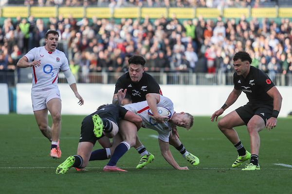 Josh Jacomb, centre, during the New Zealand All Blacks XV vs England A at The Recreation Ground, Bath, England, on 8 November 2025. Jacomb won the NPC Player of the Year award. Photo/Photosport/Anthony Hanc