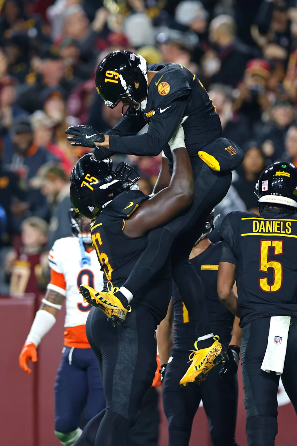 Week 6: Washington Commanders wide receiver Chris Moore (19) celebrates with teammates after scoring a touchdown during the “Monday Night Football” game against the Chicago Bears at Northwest Stadium. The Commanders wore their all-black alternate uniforms for the game.