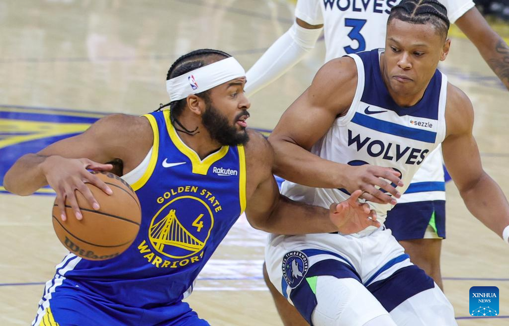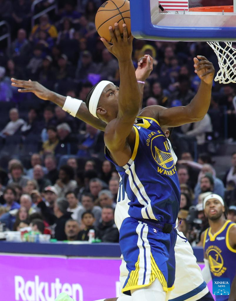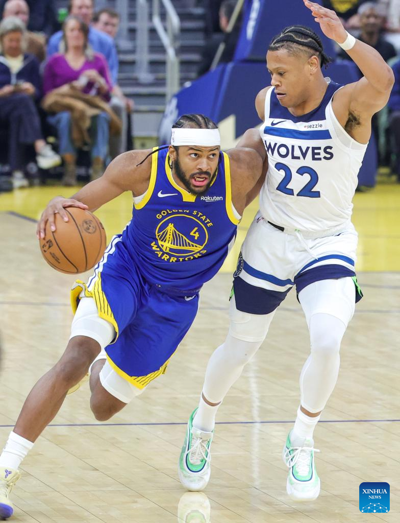 Moses Moody (L) of Golden State Warriors vies the ball during the 2025-2026 NBA regular season match between Golden State Warriors and Minnesota Timberwolves in San Francisco, the United States, on Dec. 12, 2025. (Photo by Dong Xudong/Xinhua)