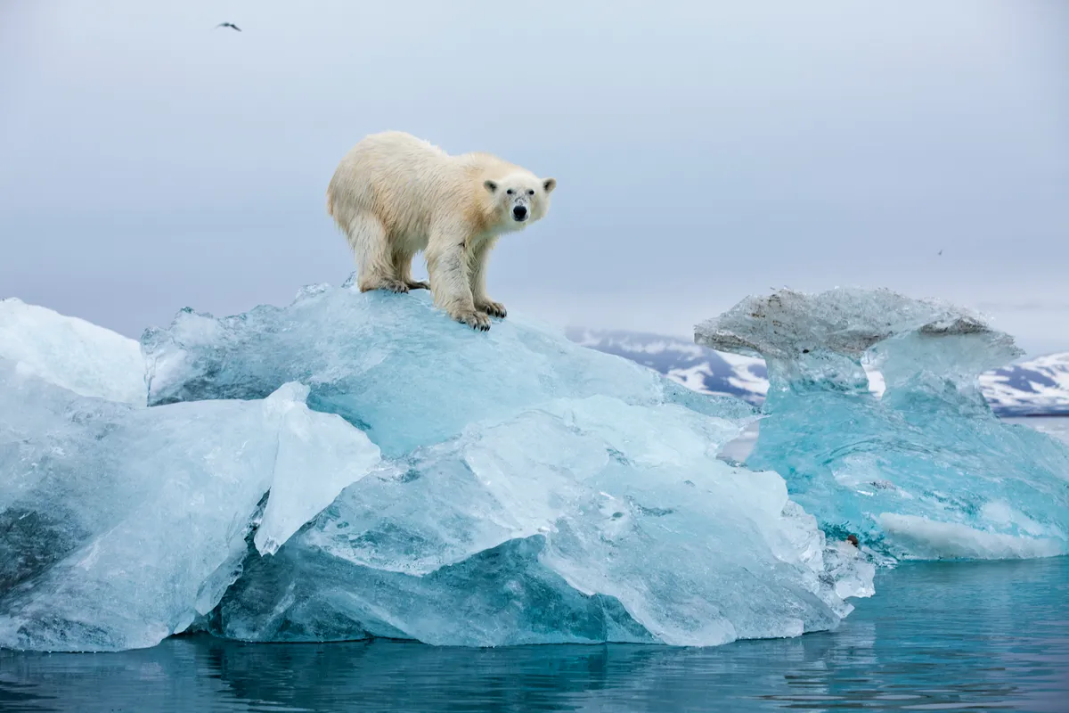 Polar bear standing on top of melting glacial iceberg in Woodfjorden in Svalbard, Norway. © Paul Souders/Getty