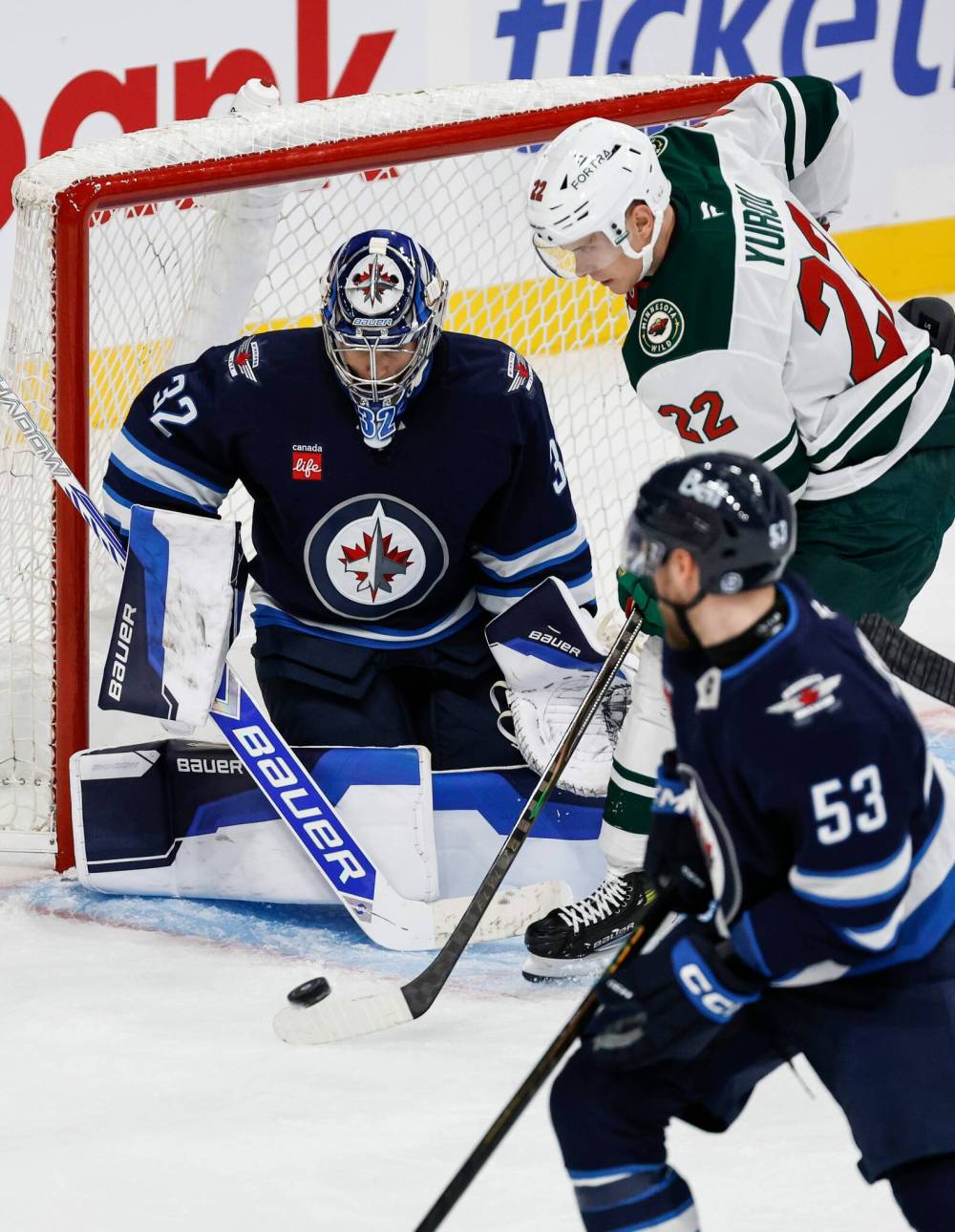 Winnipeg Jets goaltender Thomas Milic (32) gets his stick on the tip from Minnesota Wild’s Danila Yurov (22) during second period pre-season NHL action in Winnipeg on Sunday, September 21, 2025.