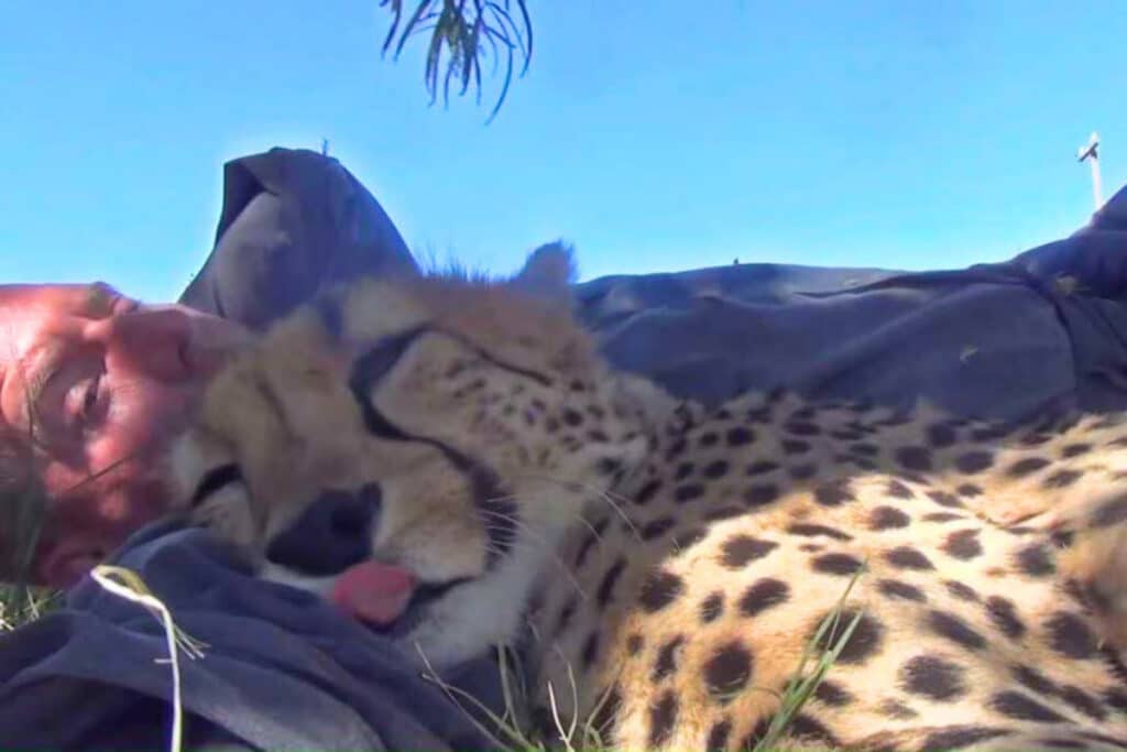 Eden, a curious female cheetah, spotted the sleeping man. Intrigued by his stillness, she approached cautiously to investigate. Sensing no danger, she gently nudged him awake with affectionate head bumps.