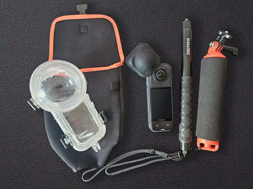 The standard Dive Bundle comes with the camera, lens cover, invisible selfie stick, floating hand grip and Invisible Dive Case