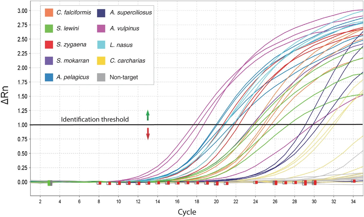 I can show you a little bit how it works. This is a paper we published in 2018. If you got a curve like this, it meant the fin you were analyzing was from one of those species. If it was a flat line, that meant it was a nontarget species.