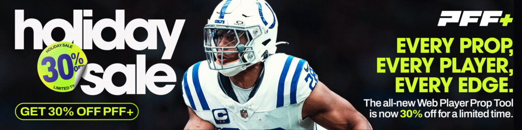 Get PFF+ for 30% off: Use promo code HOLIDAY30 to unlock the PFF Player Prop Tool, Premium Stats, fantasy dashboards, the PFF Mock Draft Simulator, industry-leading fantasy rankings and much more — everything you need to win your season.