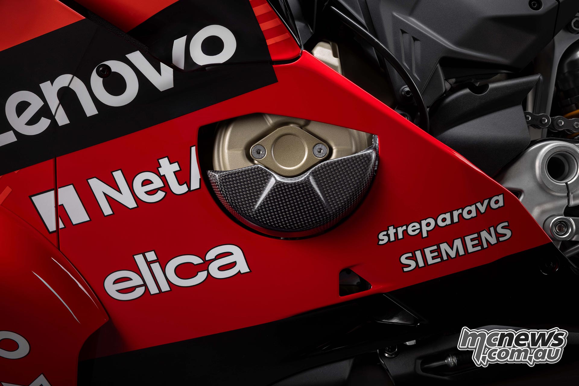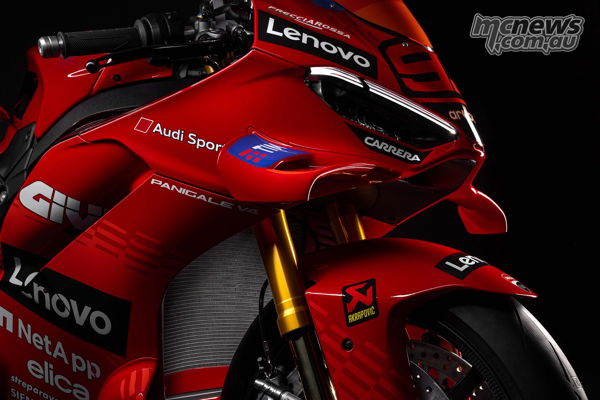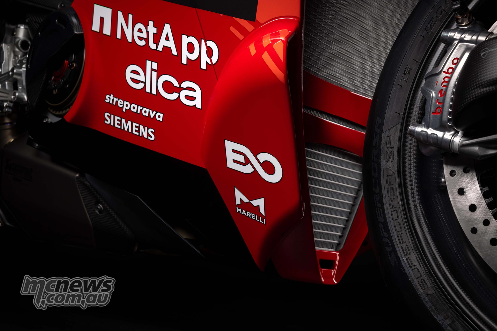 Based on the Panigale V4 S, the replica features a MotoGP-inspired livery and a series of performance-focused upgrades. A homologated Akrapovič exhaust system reduces weight by 2.5 kilograms and lifts peak output to 218.5 horsepower with a dedicated engine calibration. Carbon fibre wheels reduce unsprung mass and rotational inertia, while Corner Sidepods introduce a ground-effect aerodynamic solution first developed by Ducati in MotoGP.