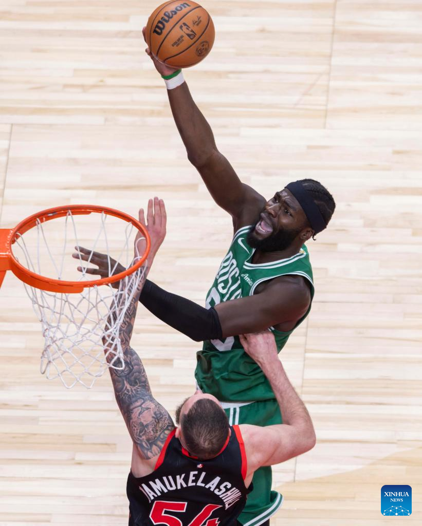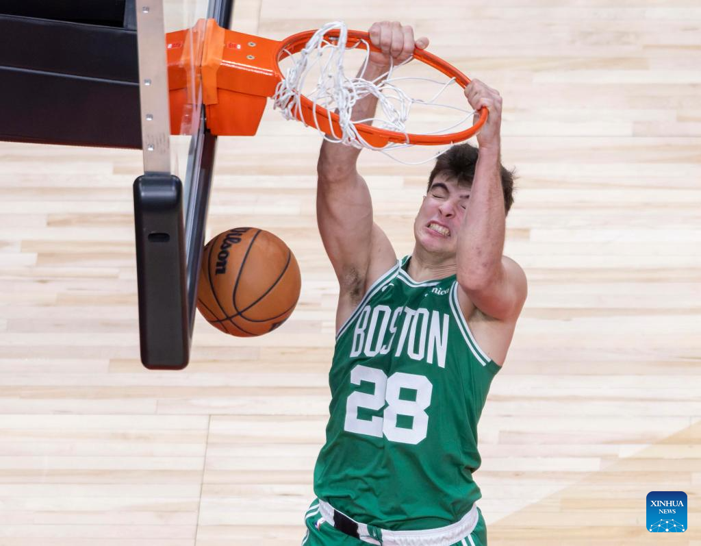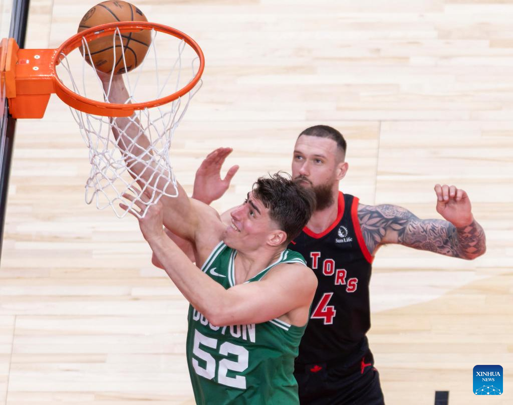 Hugo Gonzalez of Boston Celtics dunks during the 2025-2026 NBA regular season game between Toronto Raptors and Boston Celtics in Toronto, Canada, on Dec. 20, 2025. (Xinhua/Zou Zheng)