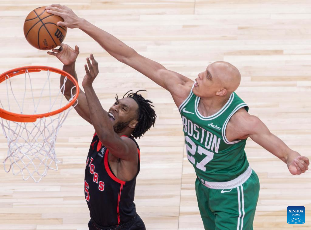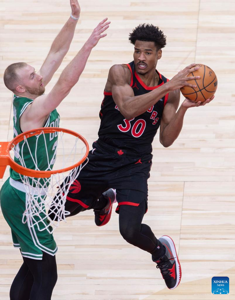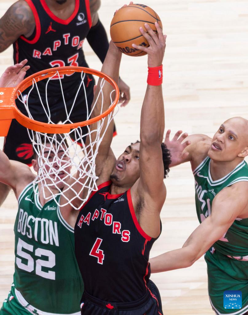 Ochai Agbaji (R) of Toronto Raptors goes for a layup during the 2025-2026 NBA regular season game between Toronto Raptors and Boston Celtics in Toronto, Canada, on Dec. 20, 2025. (Xinhua/Zou Zheng)