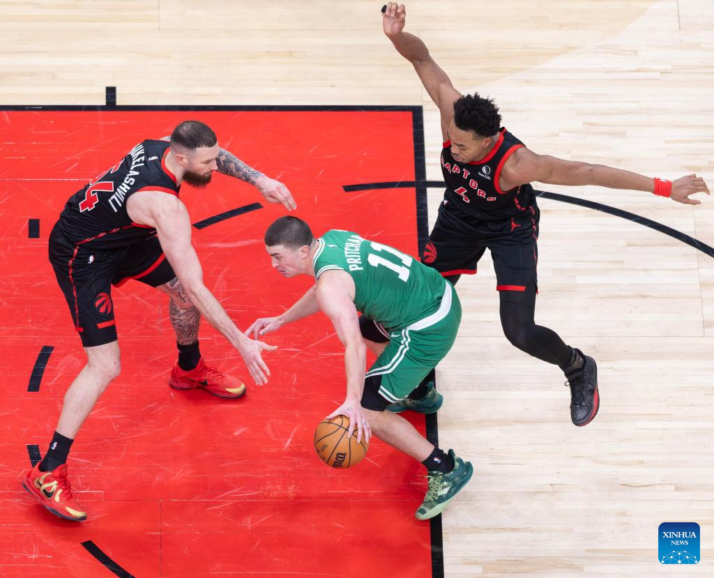 Payton Pritchard (C) of Boston Celtics breaks through during the 2025-2026 NBA regular season game between Toronto Raptors and Boston Celtics in Toronto, Canada, on Dec. 20, 2025. (Xinhua/Zou Zheng)