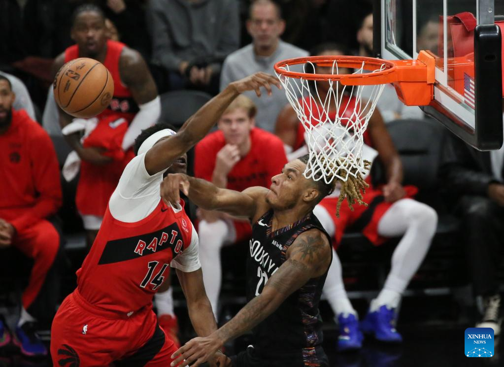 Ja’Kobe Walter (L) of Toronto Raptors gets blocked by Noah Clowney of Brooklyn Nets during the 2025-2026 NBA regular season game between Brooklyn Nets and Toronto Raptors in New York, the United States, Dec. 21, 2025. (Xinhua/Zhang Fengguo)