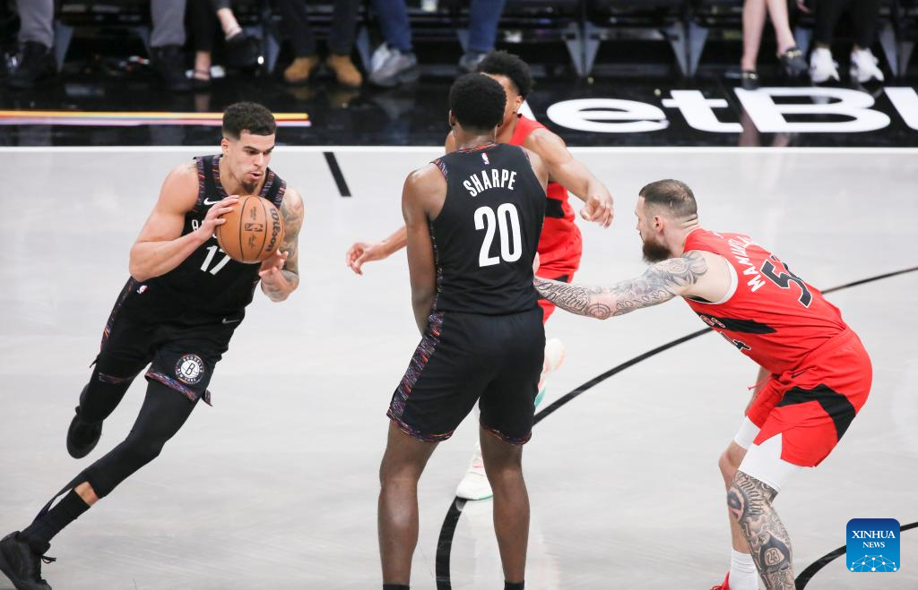 Michael Porter Jr. (1st L) of Brooklyn Nets dribbles during the 2025-2026 NBA regular season game between Brooklyn Nets and Toronto Raptors in New York, the United States, Dec. 21, 2025. (Xinhua/Zhang Fengguo)