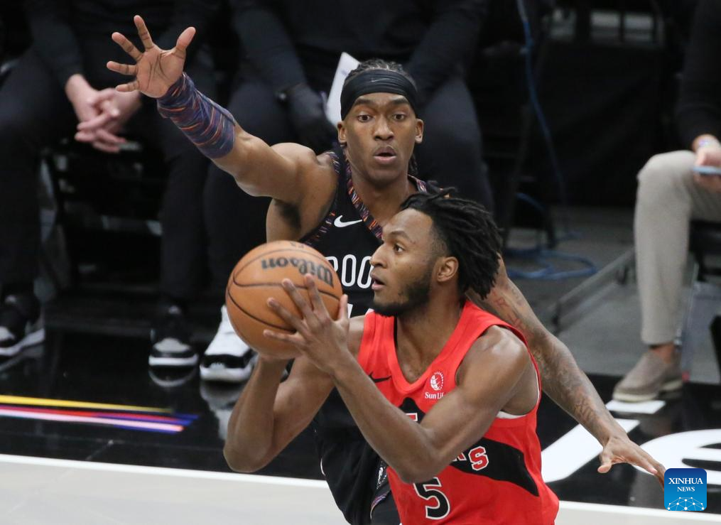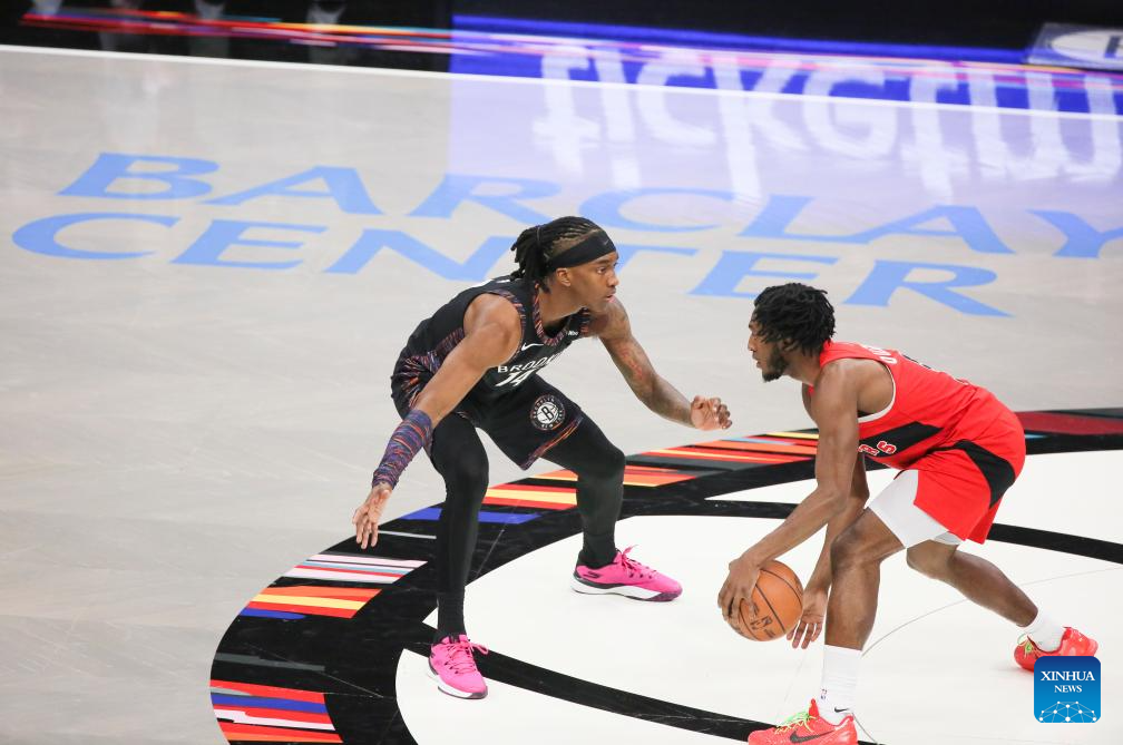 Immanuel Quickley (R) of Toronto Raptors competes during the 2025-2026 NBA regular season game between Brooklyn Nets and Toronto Raptors in New York, the United States, Dec. 21, 2025. (Xinhua/Zhang Fengguo)
