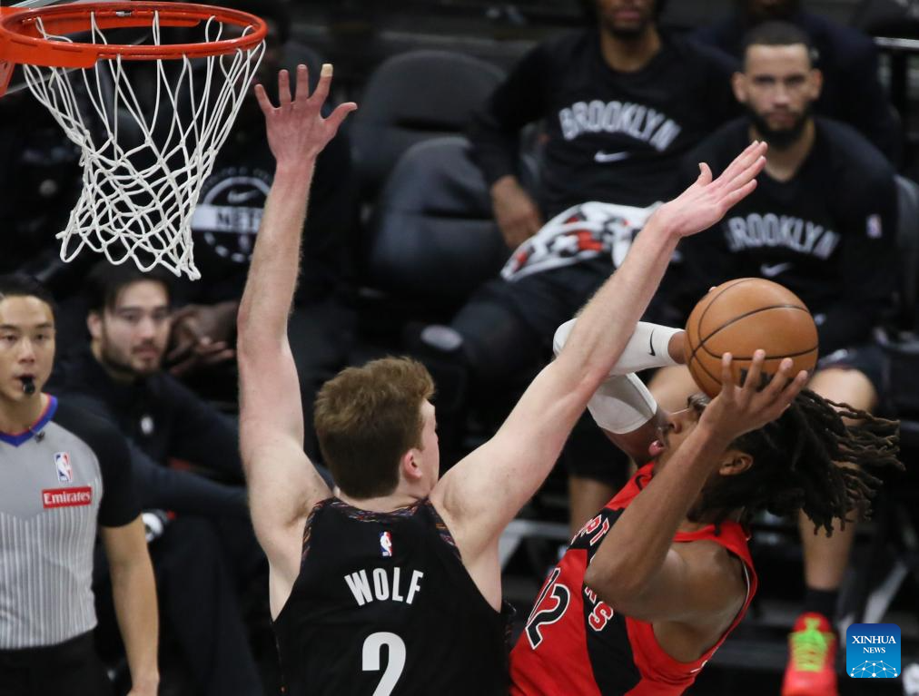 Collin Murray-Boyles (R) of Toronto Raptors goes for the basket during the 2025-2026 NBA regular season game between Brooklyn Nets and Toronto Raptors in New York, the United States, Dec. 21, 2025. (Xinhua/Zhang Fengguo)